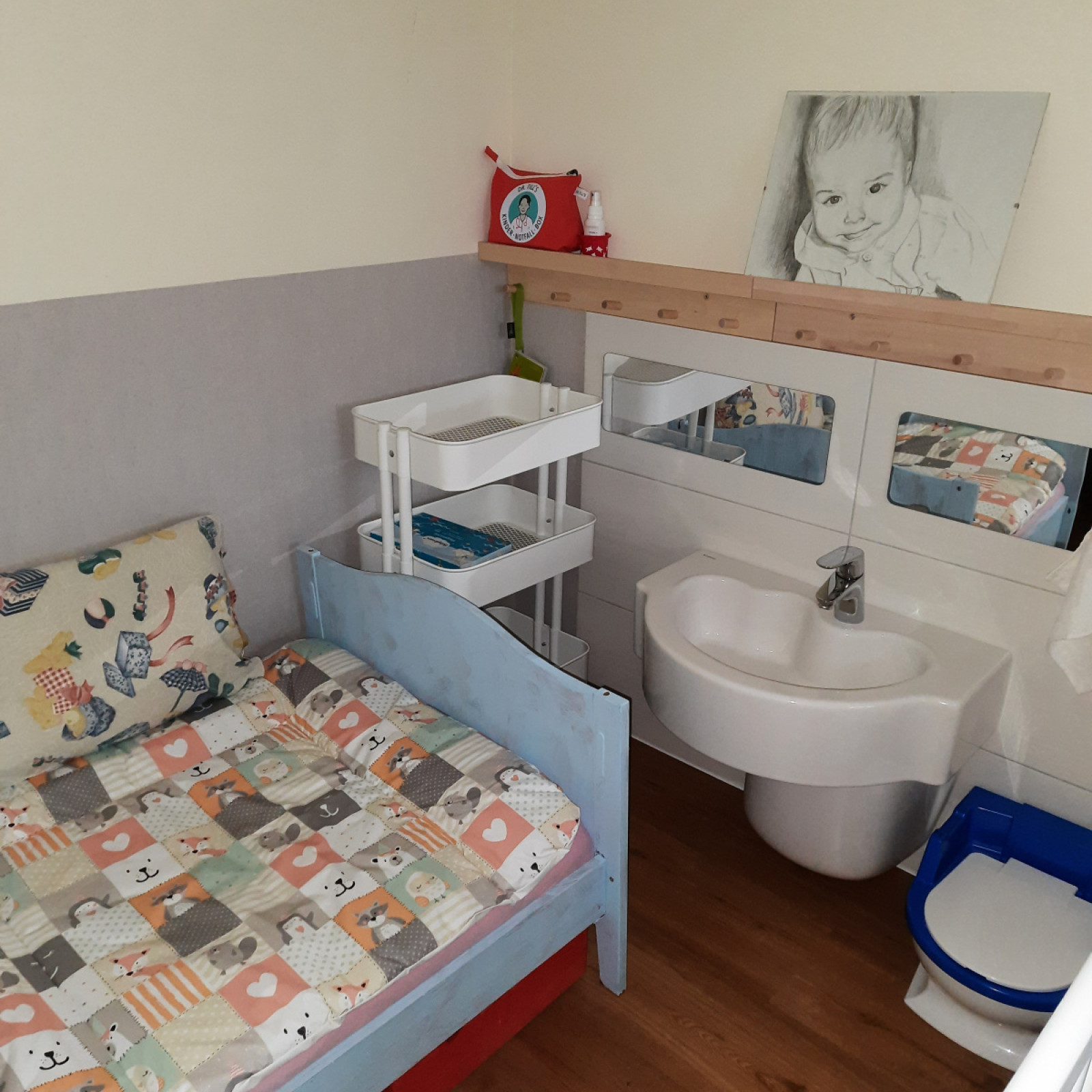 Außerdem ist in diesem Zimmer ein Pflegebereich mit kleinem Kinderwaschbecken eingerichtet.
