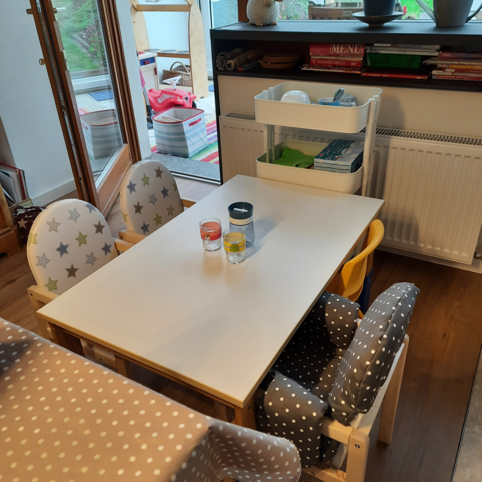 Unsere Wohnküche ist das Herz unseres Hauses. Am Kindertisch mit kleinen Stühlen nehmen wir die gemeinsamen Mahlzeiten ein, die wir soweit möglich auch gemeinsam zubereiten.