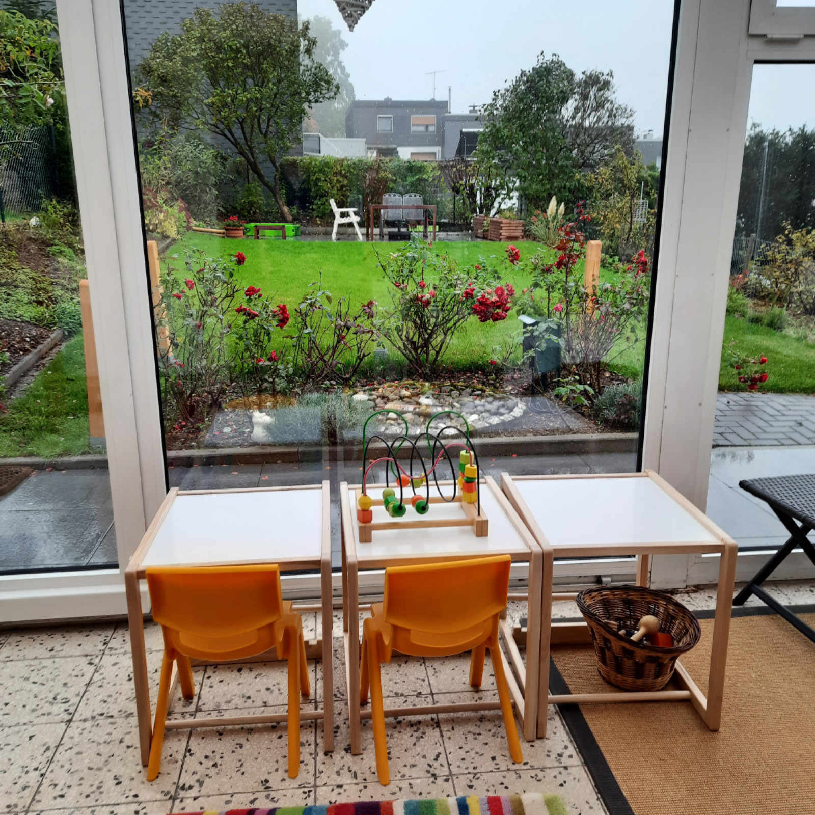 Wenn die Temperatur es zulässt, steht die Tür von der Küche zum Wintergarten immer offen. Dieser Raum lädt zum Spielen ein. Auf den Regalen findet sich ein ausgewähltes Angebot an anregenden Spielmaterialien. Gleichzeitig ist von hier aus die Natur gut zu beobachten.